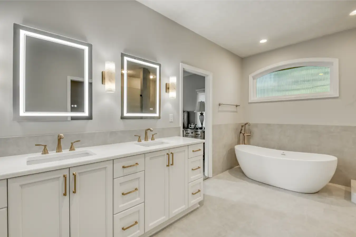 - Spa-inspired primary bathroom remodel featuring a freestanding tub centered under the window