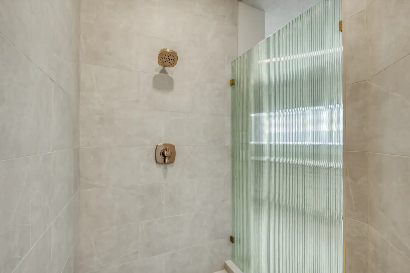 - Frameless reeded glass shower panel with satin brass hardware for a custom luxury bathroom design