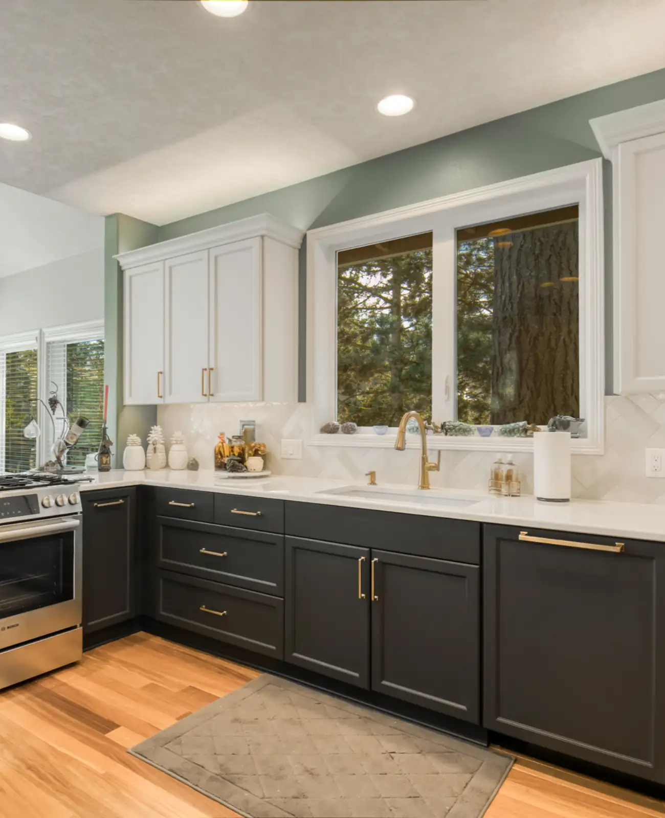 - Custom two-tone kitchen cabinetry with black lower cabinets and bright white uppers for a timeless Beaverton kitchen remodel