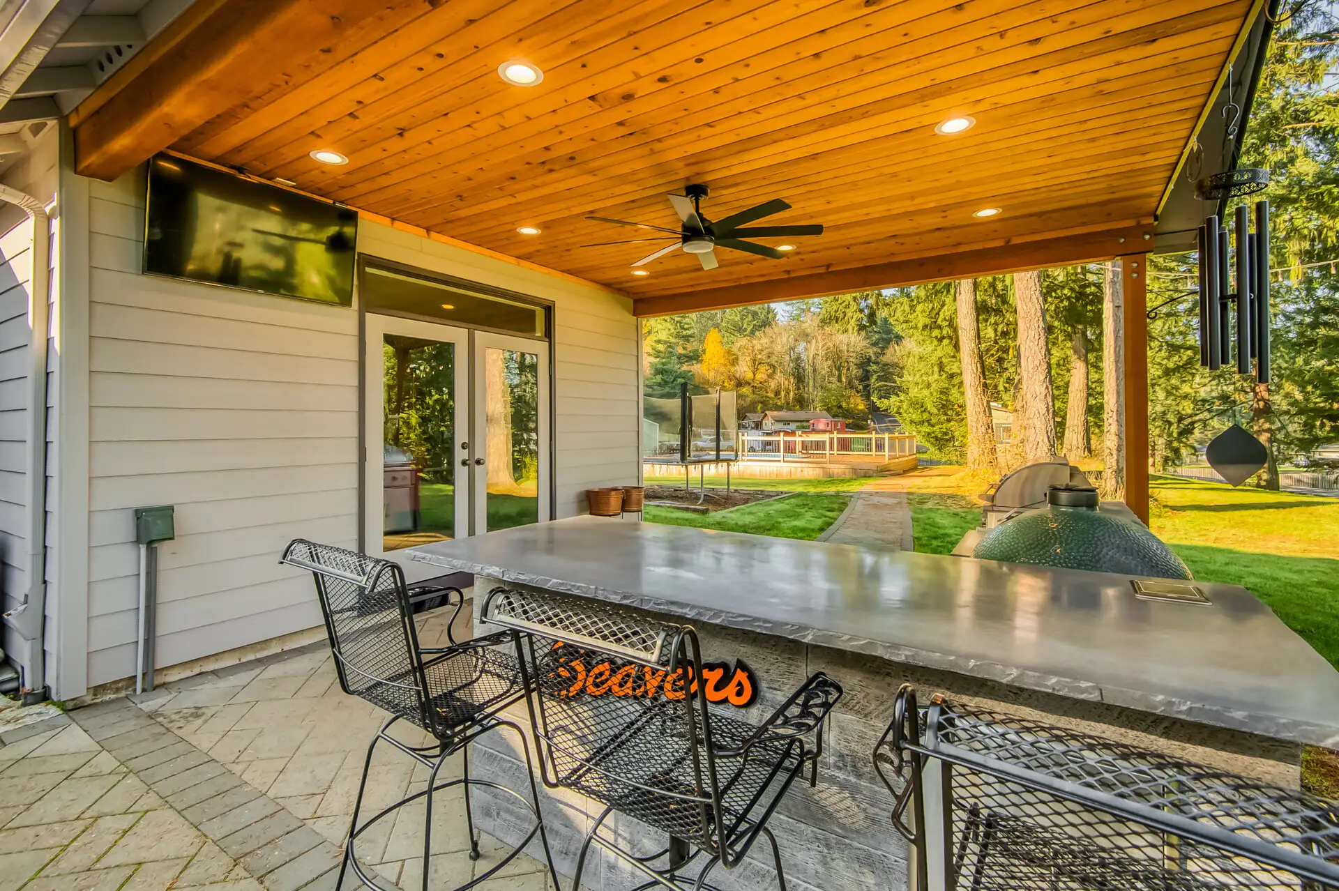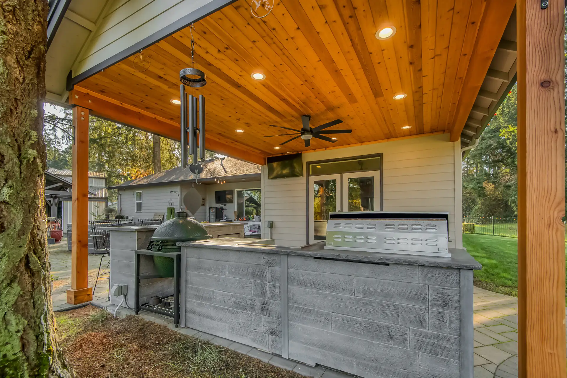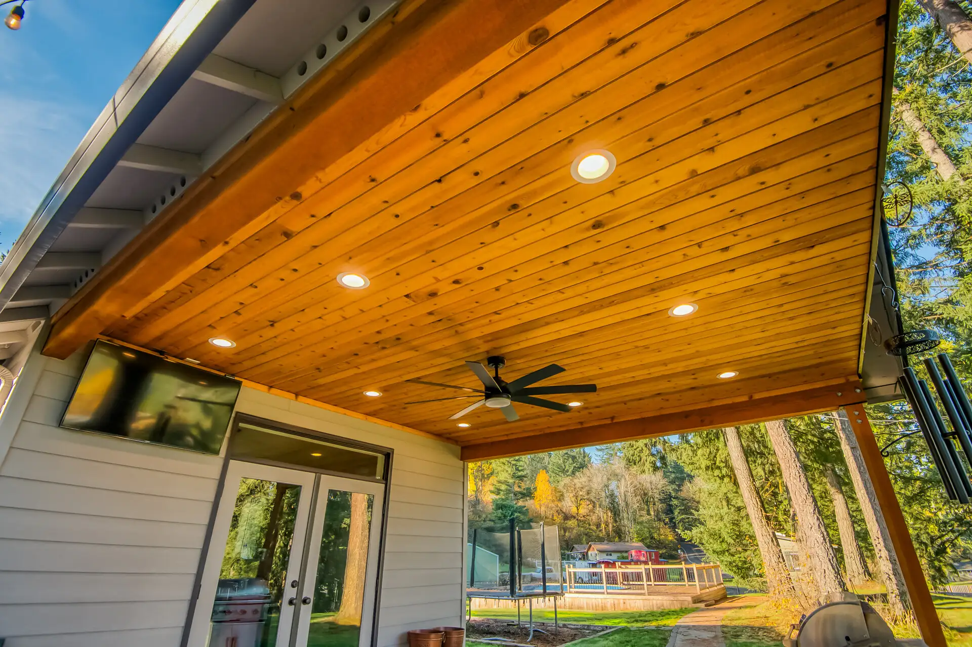 Ken and Shanna wanted to make their backyard feel like a true extension of their home — a place where they could relax, cook, gather, and enjoy Oregon evenings in comfort. We created a covered outdoor patio by extending the home’s gable roofline and installing new French doors to connect indoor and outdoor living. With warm cedar tongue-and-groove overhead, thoughtful lighting, and built-in comfort features, this space became an inviting retreat for everyday family life and entertaining.