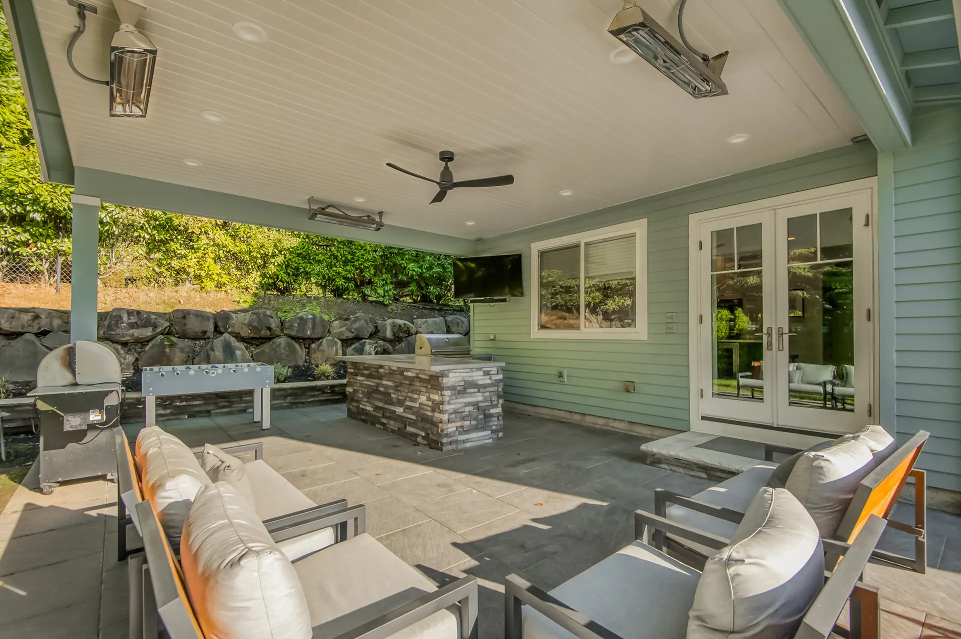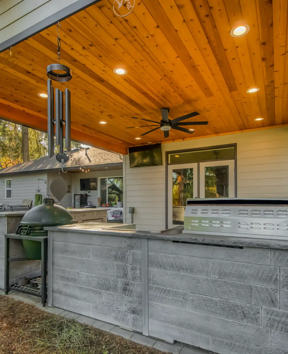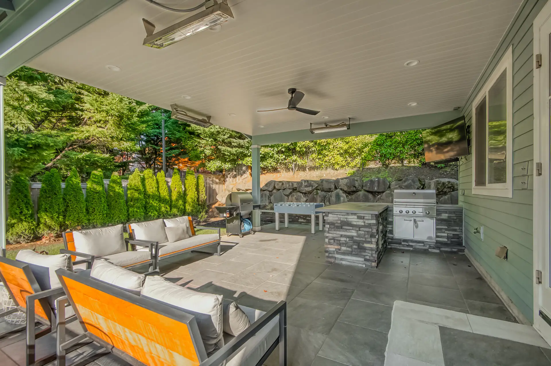 Ken and Shanna wanted to make their backyard feel like a true extension of their home — a place where they could relax, cook, gather, and enjoy Oregon evenings in comfort. We created a covered outdoor patio by extending the home’s gable roofline and installing new French doors to connect indoor and outdoor living. With warm cedar tongue-and-groove overhead, thoughtful lighting, and built-in comfort features, this space became an inviting retreat for everyday family life and entertaining.