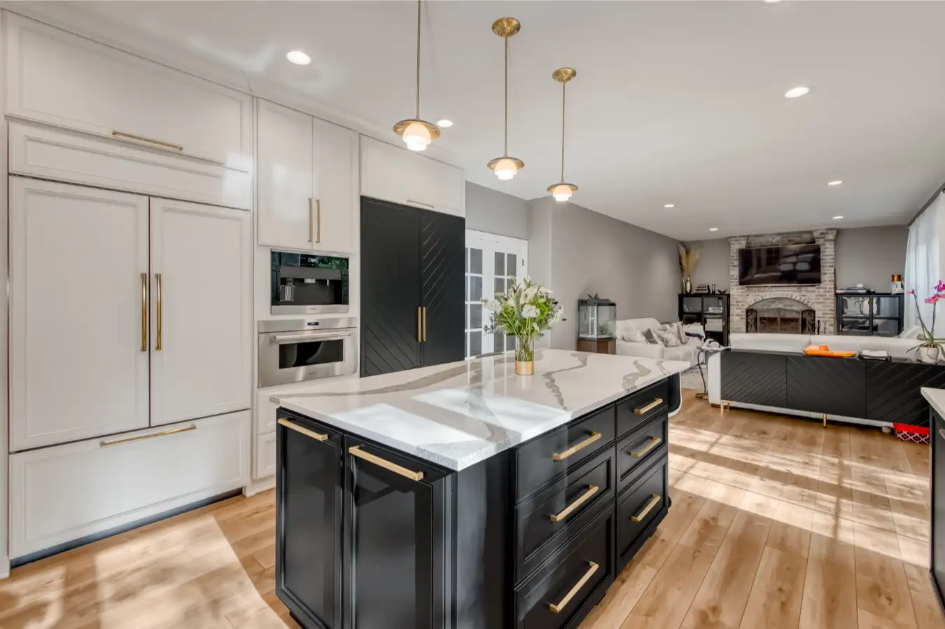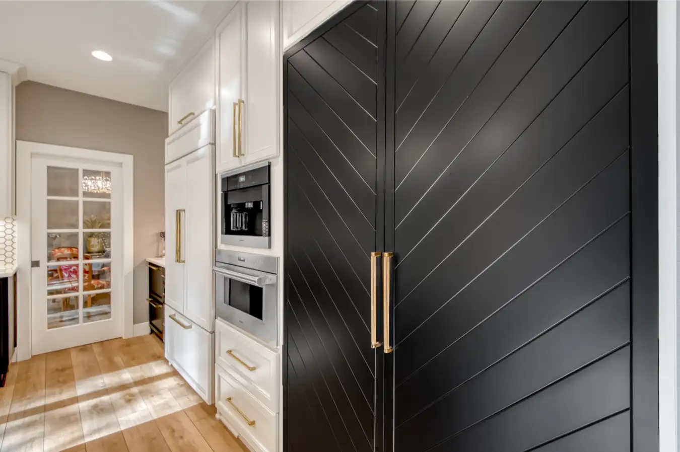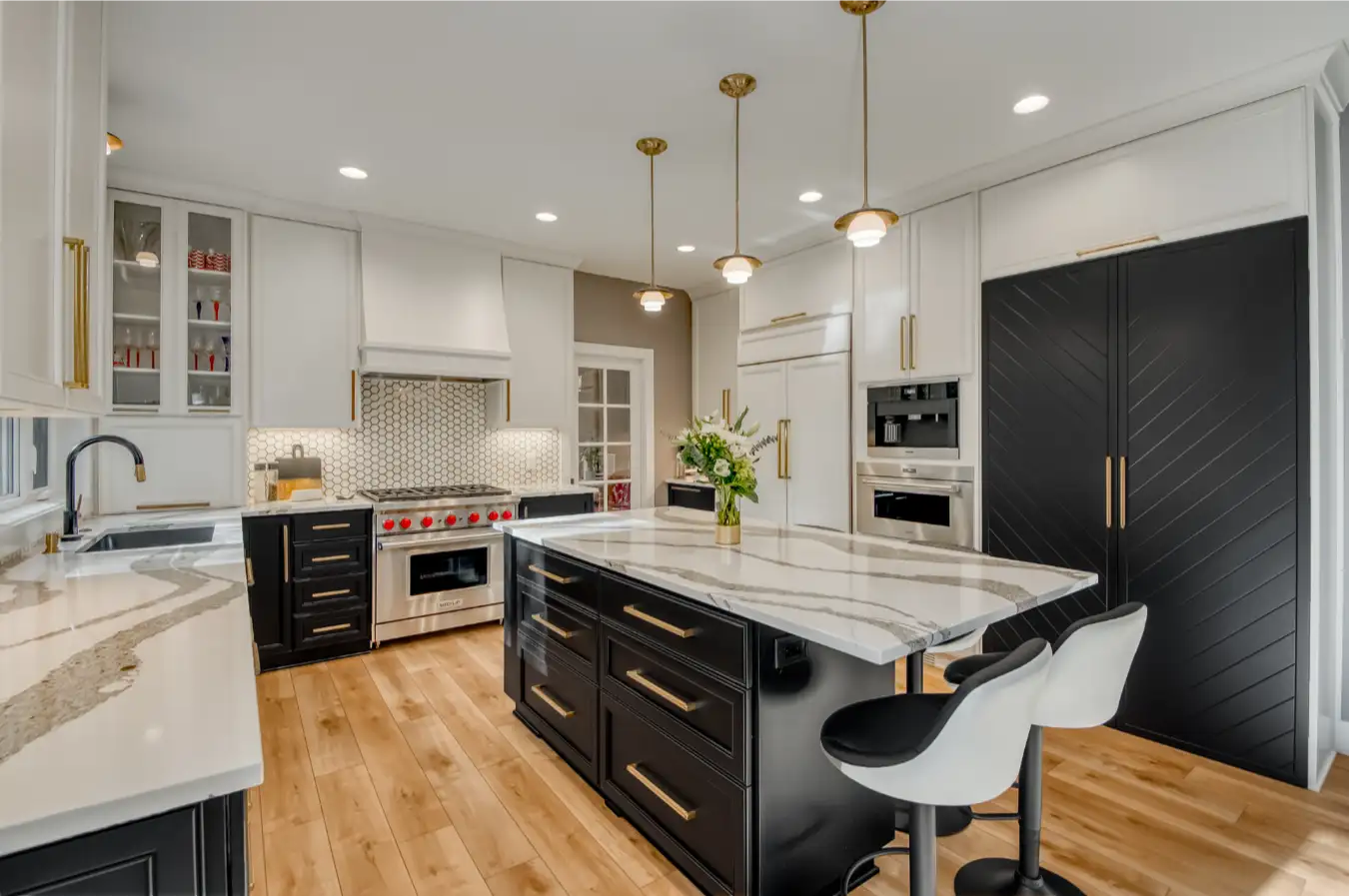 Victoria and Dennis’ West Linn kitchen was redesigned to feel bright, functional, and truly custom. A large statement island anchors the space for cooking and gathering, while two-tone cabinetry and warm brass accents add modern elegance. Specialty details like a built-in dog feeding station, chevron pantry doors, and Cambria quartz surfaces make this kitchen both personal and beautifully crafted. Features: Chevron pantry doors